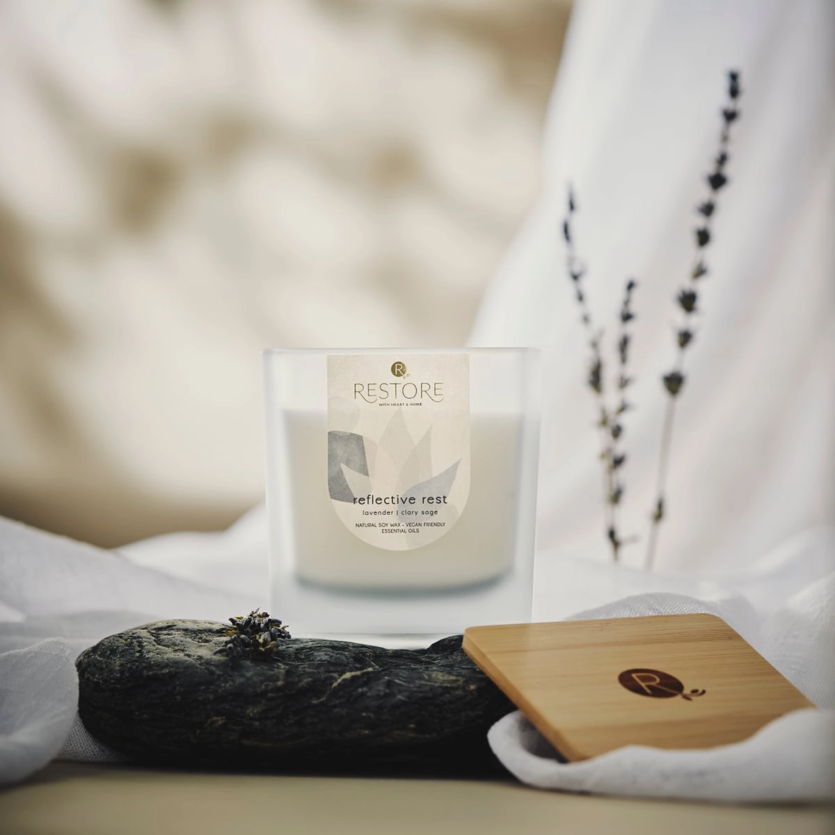 Every detail is thoughtfully crafted for wellbeing – FSC-certified whisper wicks provide a gentle, comforting crackle, while the elegant bamboo wooden lid not only preserves your candle’s purity but doubles as a stylish coaster for your moments of mindfulness. Reclaim your peace with the Restore candle, a perfect companion for your journey to balance and relaxation.
